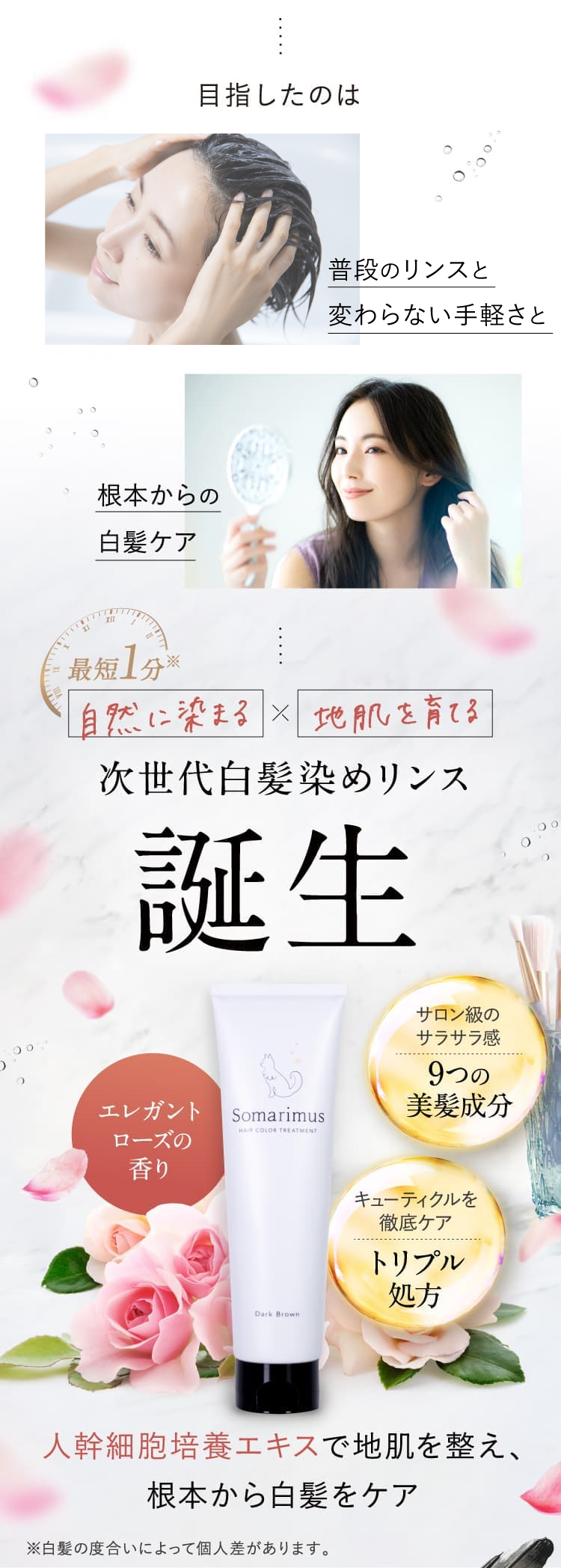 白髪を染めながら頭皮もケアできるダブルの処方の新発想白髪ケア。リンスをする感覚で自然な髪色に。使うたびにつややか、サラサラヘアーへ。 プロ仕様のヘアカラーとトリートメントをご自宅で。